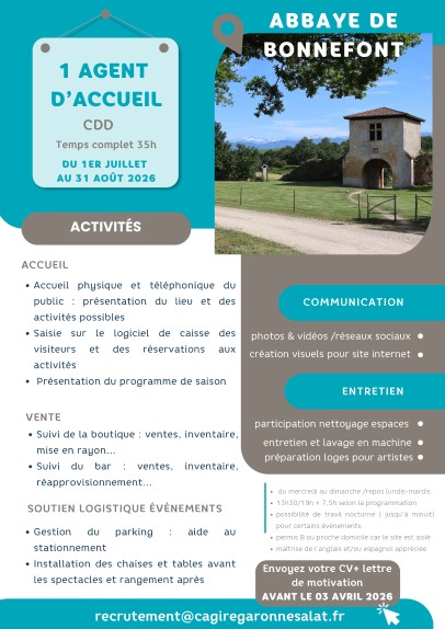 Le Syndicat mixte de l'Abbaye de Bonnefont recherche 1 agent d’accueil (CDD - 35h)